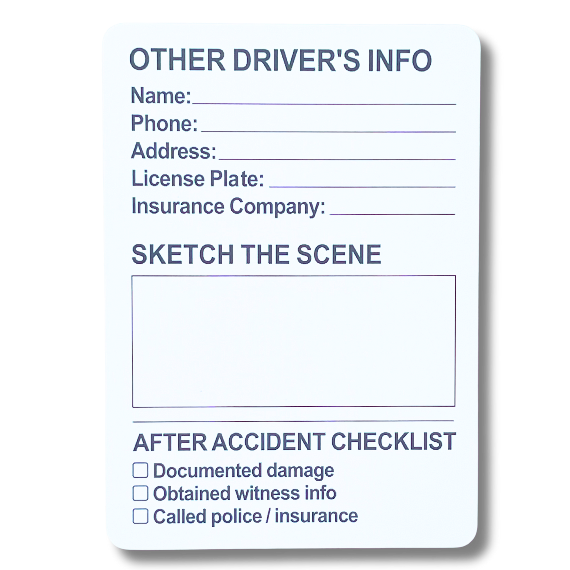 Crash Response Card — post-accident checklist with write-in sections to document everything on the spot