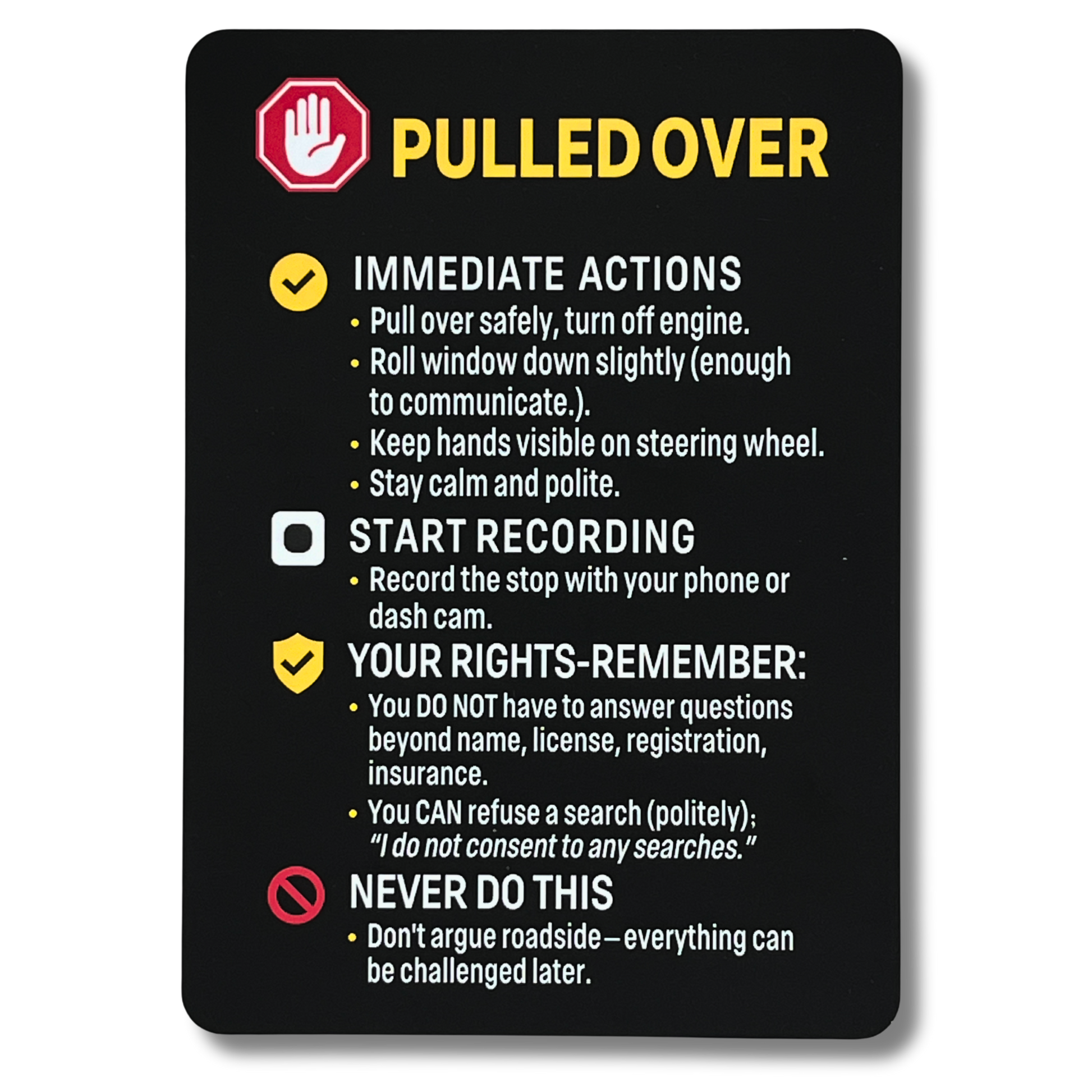 Pulled Over Card — bold, step-by-step rights reminder to help you stay safe and in control